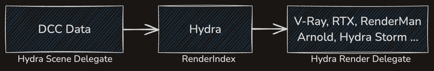 Hydra is a generalized pipeline for custom renderers by providing interfaces to implement the bussiness logic to process data contained in USD as a customizable chain of runtime scene analysis. Its is not tightly coupled to any runtime data layer, allowing Hydra to compile USD into a deeply vectorized data layout, fabric.