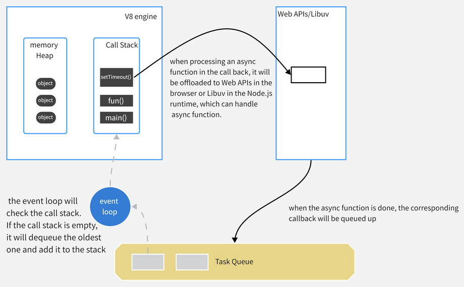 The implementation of event loop, however, can vary in different runtimes due to different runtime-specific APIs and implementation structure. For instance, Node.js runtime doesn't have Web Apis, such as DOM or the Window, while browser runtime doesn't have file system operations. As well as, event loop is provided through Web API in browser runtime and throug libuv in Node.js runtime.