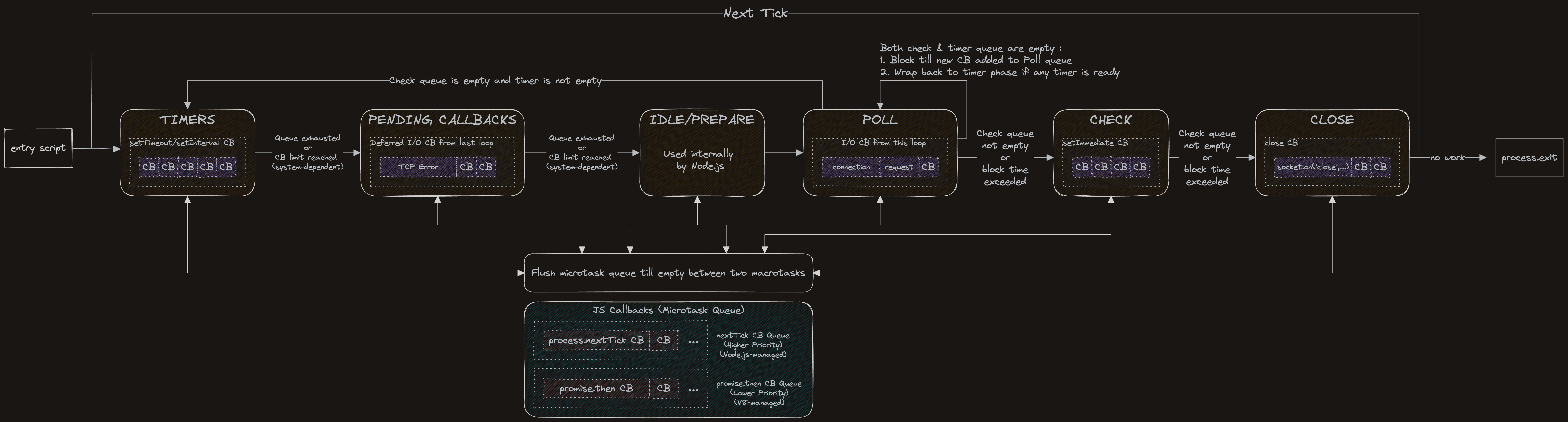 Once a macrotask is completed, event loop will check for queued up microTasks and flush them until exhausted before excution another macrotask. And these process repeats throughout the event loop. And Every time the event loop takes a full trip, it's called a tick.